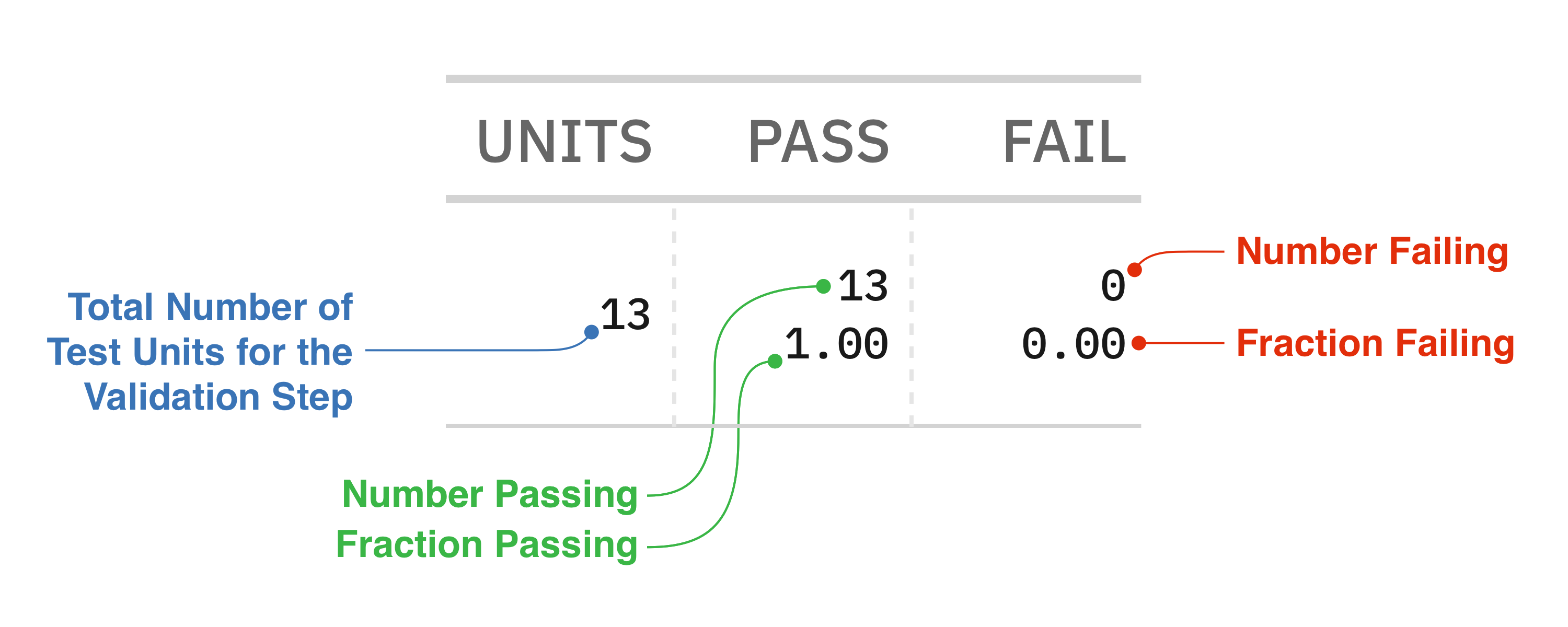 All of those numbers under the UNITS, PASS, and FAIL columns have to do with test units, a measure of central importance in Pointblank. Each validation step will execute a type of validation test on the target table. For example, a col_vals_lt() validation step can test that each value in a column is less than a specified number. The key finding that’s reported as a result of this test is the number of test units that pass or fail. This little diagram explains what those numbers mean: